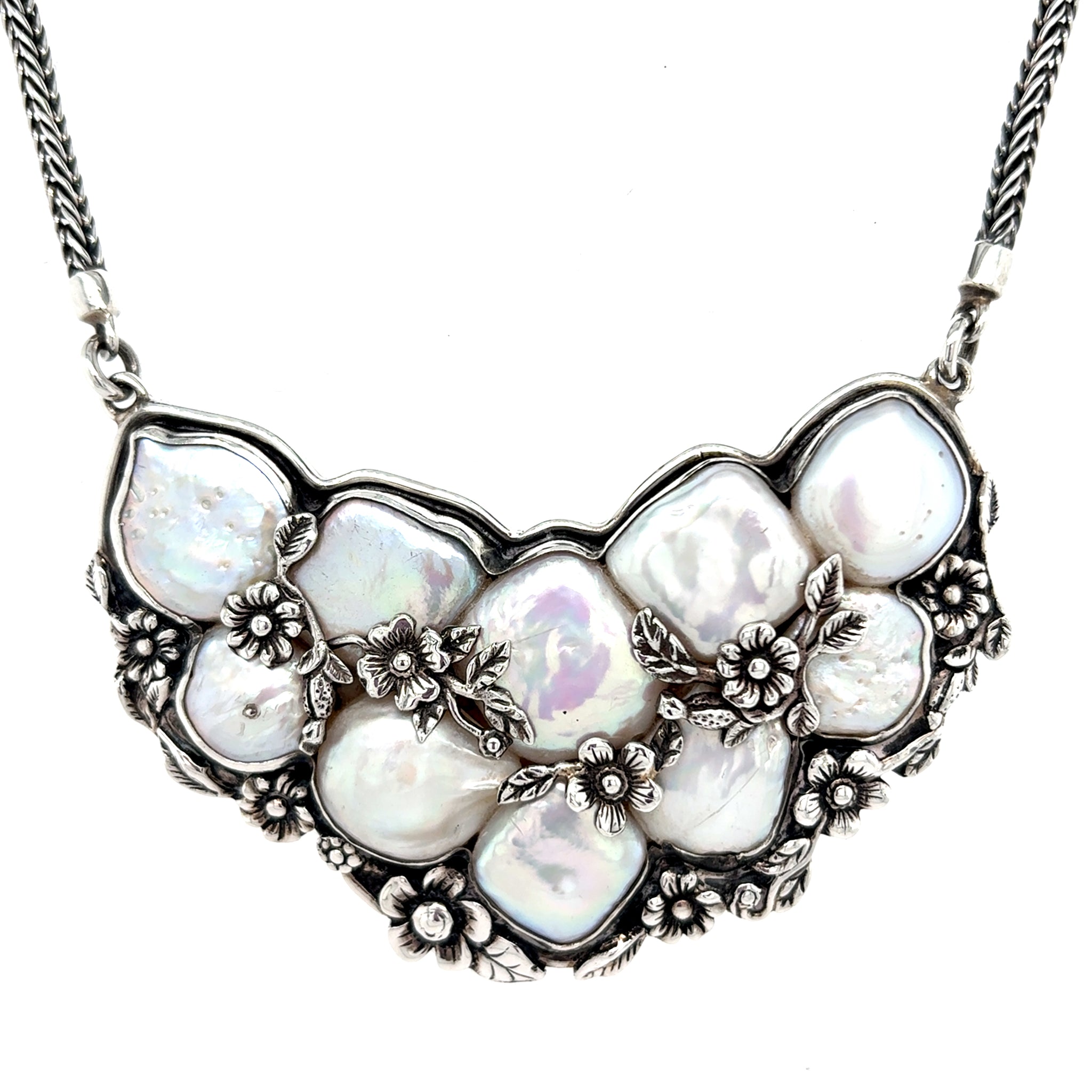 Our freshwater pearl bib necklace is handmade from solid Sterling silver and has lustrous cream and pearls worked into a beautiful cluster. For an artistic finish, the pearls are encased in Sterling silver with a burnished finish and include small flower details.